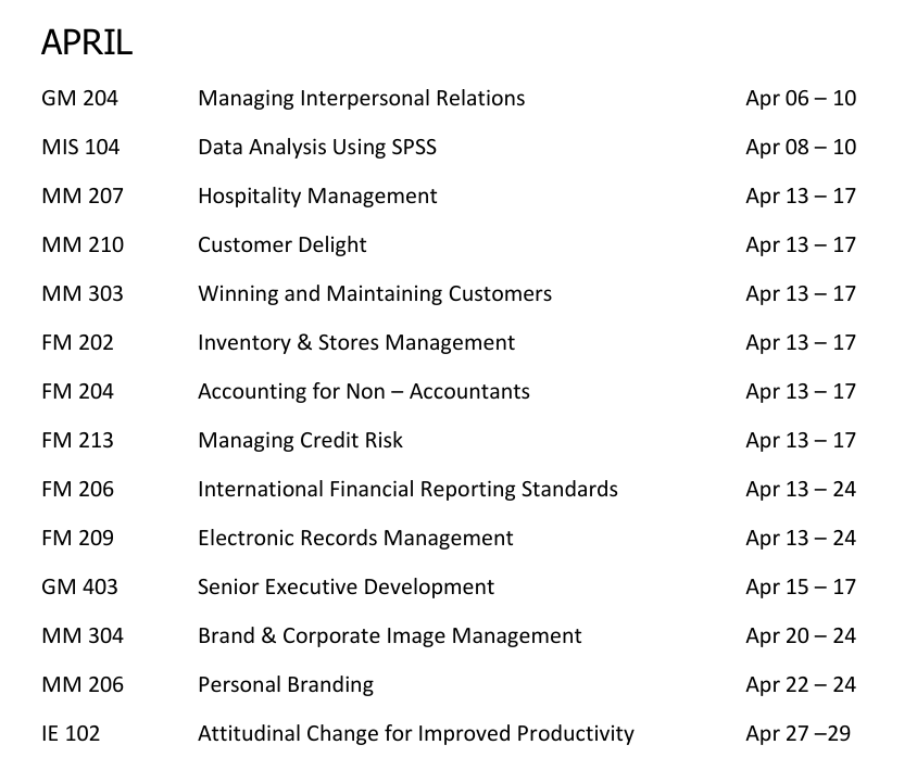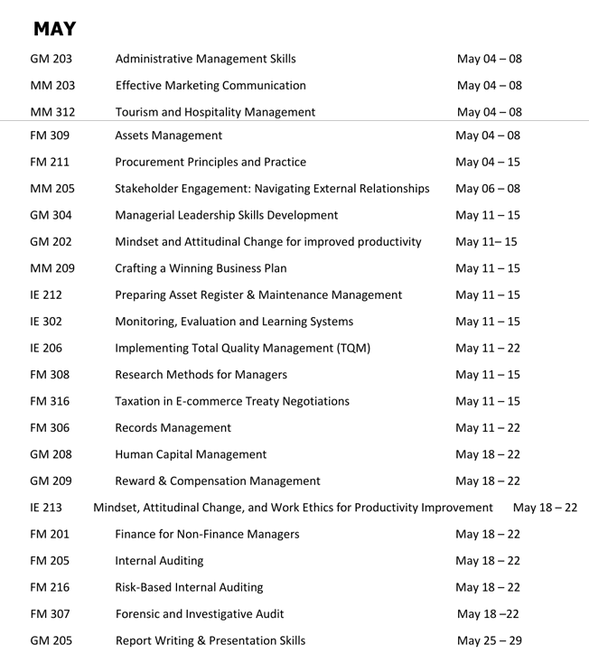 UPCOMING MANAGEMENT TRAINING PROGRAMMES 2026 https://www.mdpi.gov.gh/upcoming-training-programme-2026/ https://www.mdpi.gov.gh/upcoming-training-programme-2026/#respond Sun, 25 Jan 2026 14:28:59 +0000 https://www.mdpi.gov.gh/?p=867 Programs offered for the month of April